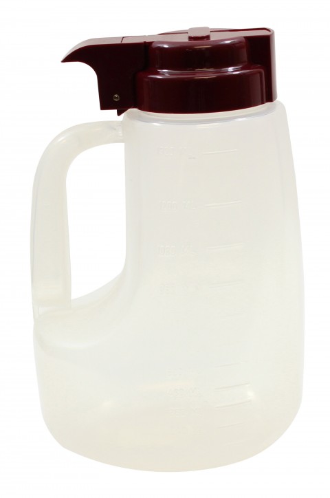 Option™ Dispenser, 48 oz., 5-1/4" x 4-1/2" x 8", graduated markings, dishwasher safe, clarified polypropylene, plastic lid, maroon, BPA free, made in USA (must be purchased in multiples of 6 each)
