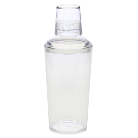 Cocktail Shaker, 27 oz., 3 piece set includes: shaker, strainer, and 3 oz. cap, dishwasher safe, break resistant, BPA free, SAN plastic, clear (1 set minimum order)