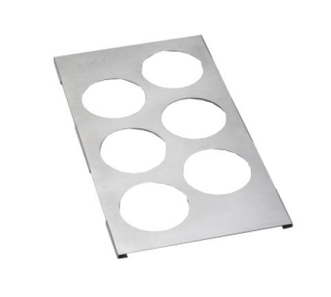 Squeeze Bottle Template, 6-hole, holds 12, 16 or 24 oz. bottles (63 mm dia.), fits 1/3 size food pan, dishwasher safe, 18/8 stainless steel (1 each minimum order)