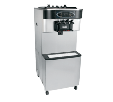 Twin Twist Soft Serve Freezer, floor model, self-contained, pump-style, (2) 20 QT hoppers, (2) 3.4QT freezing cylinders, indicator lights, touchscreen controls, standby, stainless steel finish, (2) locking casters, R449A, (2) 1.5 HP motor, NSF, cULus listed. Visit the Taylor website link to locate your distributor for pricing and warranty information.