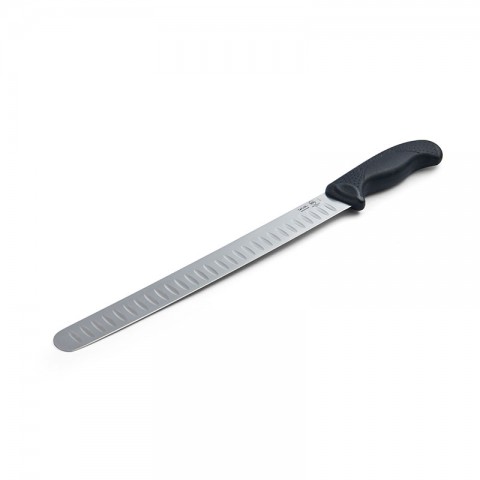 Slicer Knife, 17-3/4"L overall, 12" blade, stamped, kullens (hollow edge), dishwasher safe, stain resistant, high carbon German steel, non-slip nylon/silicone handle, black, NSF (must be purchased in case quantities)