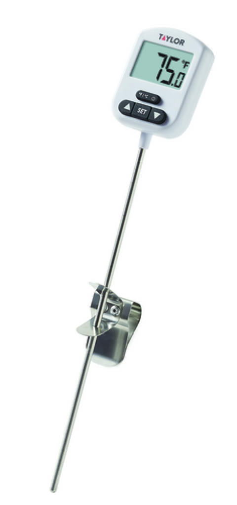 Candy/Deep Fry Thermometer, digital, angled head, -40° to 450°F (-40° to 230°C) temperature range, 3/4" backlit display, programmable alert, 9" stainless steel stem with adjustable pan clip, CR2032 battery (included) (case pack cannot be broken)