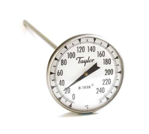 Bi-Therm® Pocket Thermometer, dial, 0° to 250°C temperature range, 2°C divisions, 1-3/4" superior grade dial, with 8" stem, +/- 2°F/1°C accuracy of entire range, high visibility dial graphics, anti-parallax dial/case, extended scale design, 3 point calibration, shock protection, recalibratable, stainless steel exterior (packed in individual boxes) (case pack can be broken)