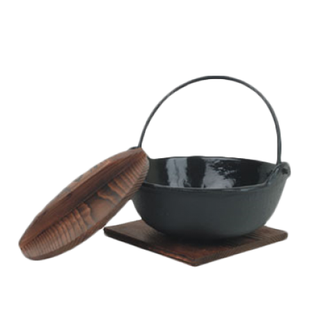 Japanese Noodle Bowl, 32 oz., round, swing handle, includes wooden lid & base, cast iron