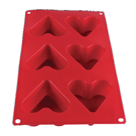 Baking Mold, 4-2/5 oz., -40° - 550°F temperature range, (6) heart cavities, flexible, unbreakable, non-stick, stain resistant, dishwasher safe, high heat silicone, red, FDA approved
