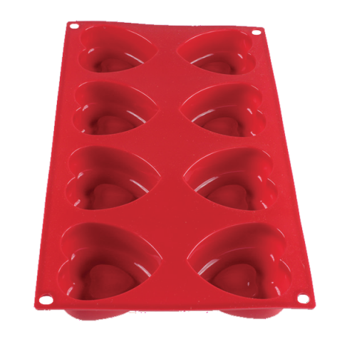 Baking Mold, 2-2/5 oz., -40° - 550°F temperature range, (8) heart cavities, flexible, unbreakable, non-stick, stain resistant, dishwasher safe, high heat silicone, red, FDA approved