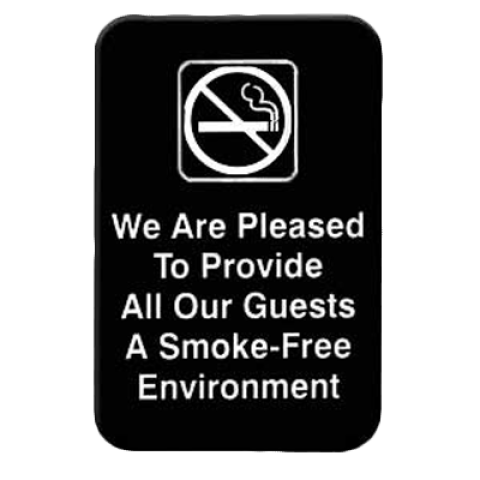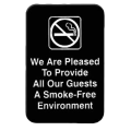 Information Symbol Sign, 6" x 9", We Are Pleased To Provide All Our Guests A Smoke-Free Environment, self-adhesive backing, white lettering on black background (12 each minimum order)