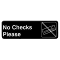 Information Symbol Sign, 9" x 3", "No Checks Please", self-adhesive backing, white lettering on black background (12 each minimum order)