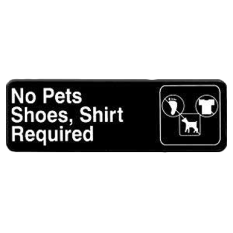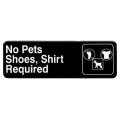 Information Symbol Sign, 9" x 3", "No Pets/Shoes Shirt Required", self-adhesive backing, white lettering on black background (12 each minimum order)
