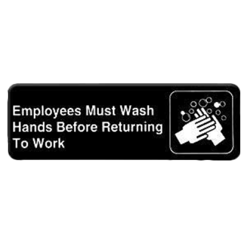 Information Symbol Sign, 9" x 3", "Employees Must Wash Hands Before Returning to Work", self-adhesive backing, white lettering on black background (12 each minimum order)