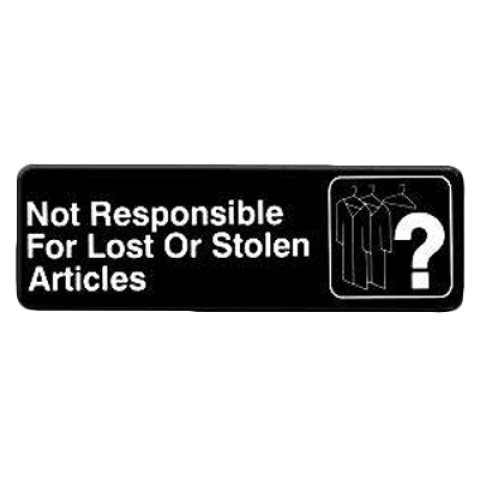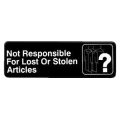 Information Symbol Sign, 9" x 3", "Not Responsible For Lost Or Stolen Articles", self-adhesive backing, white lettering on black background (12 each minimum order)