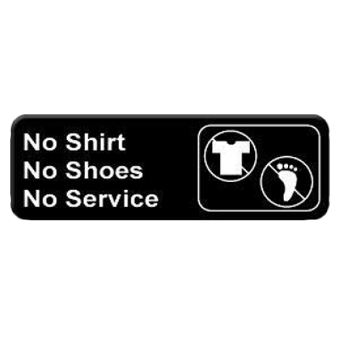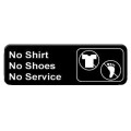 Information Symbol Sign, 9" x 3", "No Shirt, No Shoes, No Service", self-adhesive backing, white lettering on black background (12 each minimum order)