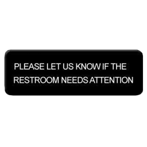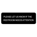 Information Symbol Sign, 9" x 3", "Please Let Us Know If The Restroom Needs Attention", self-adhesive backing, white lettering on black background (12 each minimum order)