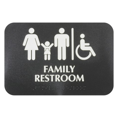 Information Symbol Sign, 9" x 3", "Family Restroom", with braille, self-adhesive backing, white lettering on black background (6 each minimum order)