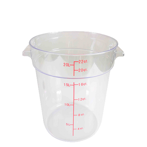 Food Storage Container, 22 quart, round, shatter and scratch resistant, -40° to 210° F temperature range, polycarbonate, clear, NSF (6 each minimum order)