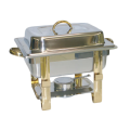 Chafer, 4 quart, half-sized, rectangular, dripless water pan, fuel holder and plate, gold handles and supporting legs, stainless steel