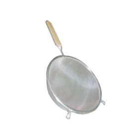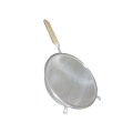 Strainer, 10" dia., double fine mesh, pan hooks, enclosed wooden handle, tin (6 each minimum order)