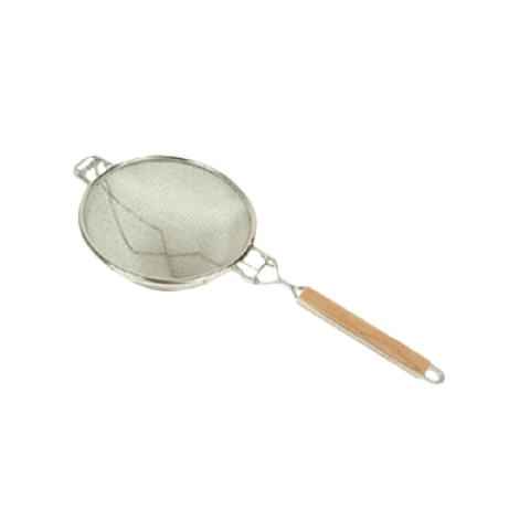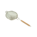 Strainer, 9-1/2" dia., reinforced, double fine mesh, pan hooks, flat wooden handle, nickel plated frame