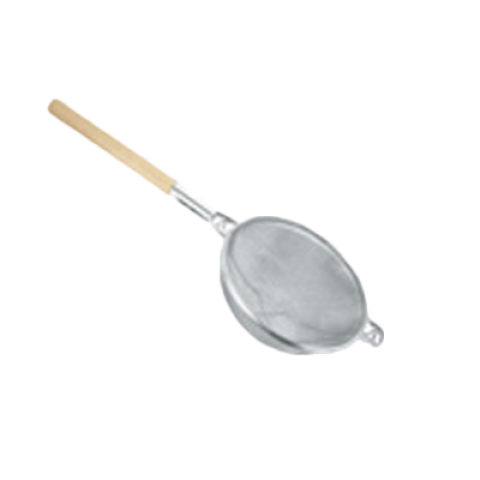 Strainer, 11-3/4" dia., reinforced, double fine mesh, pan hooks, round wooden handle, nickel plated frame