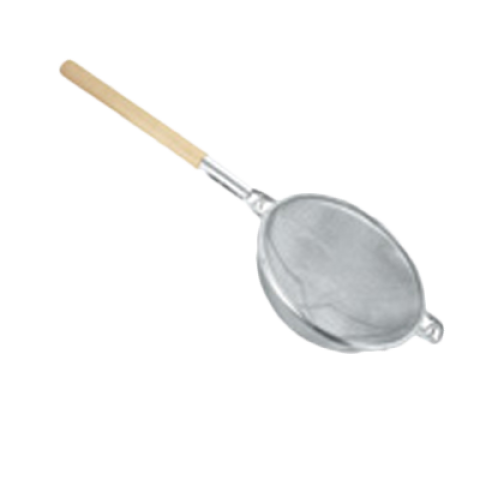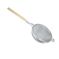 Strainer, 13-3/4" dia., reinforced, double fine mesh, pan hooks, flat wooden handle, nickel plated frame