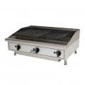 Charbroiler, gas, countertop, 36" wide, steel 30,000 BTU burners with adjustable manual controls every 12", lava rock briquettes, welded steel frame with stainless steel top and front, aluminized steel sides, cast iron broiling grates, stainless steel water pan, splash guard & grease trough, 4" legs, 90,000 BTU, cULus, UL EPH Classified, Made in USA