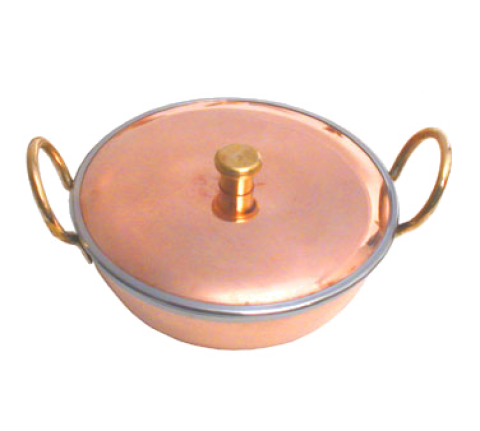 Wok with Cover, 22 oz. capacity, 2-1/4"H x 7-1/4"W 6-1/4"D, round, (2) handles, brass knob, laminated copper exterior & polished stainless steel interior (LIMITED STOCK – contact factory for availability)
