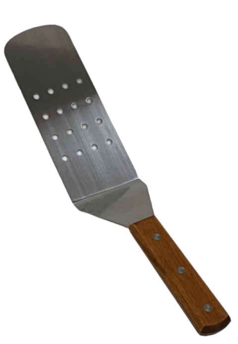Perforated Turner, 14"L x 2-3/4"W, wooden handle. 9.5”blade length
