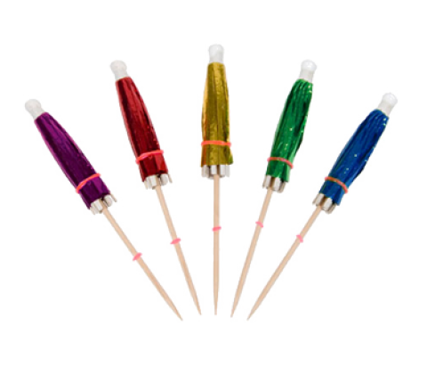 Cocktail Parasol, 4"L, foil, wooden stem, assorted colors (144 pieces per box)
