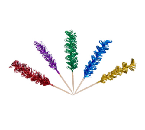Cocktail/Food Pick, 4"L, curly foil frill top, wooden stem, assorted colors (100 per pack)