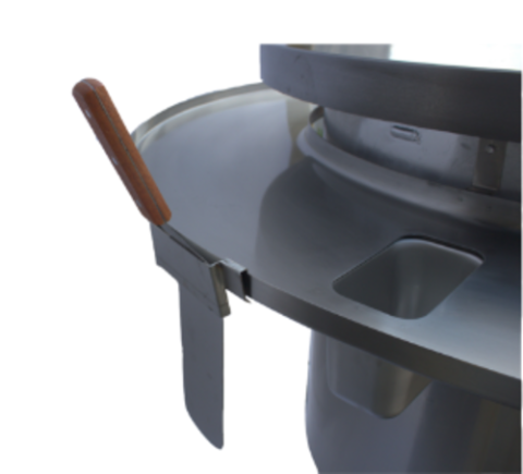 Spatula clip hooks onto the scrap ring of any Town MBR and provides a convenient way to hold a spatula when not in use.