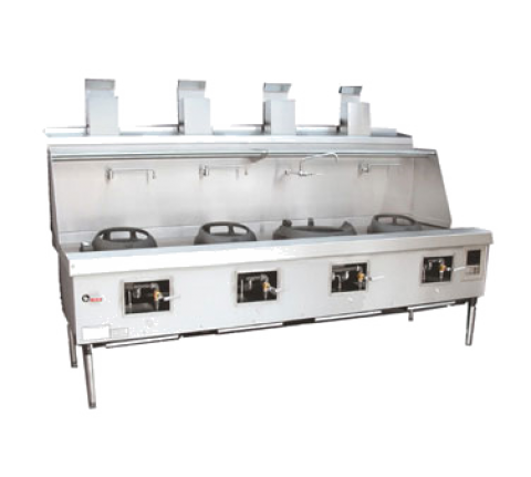 York® Wok Range, Gas, (4) chambers, fiber ceramic insulation, (4) high flue risers, water cooled top, Chinese swing faucets, knee "L" lever gas handle, black epoxy coated sides, ETL, NSF
