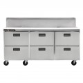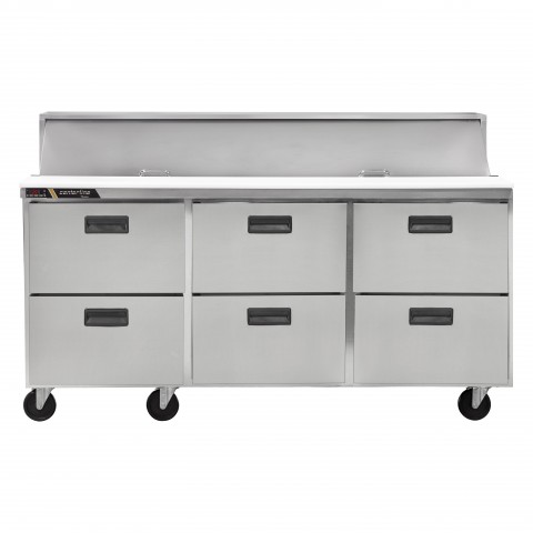 Centerline™ by Traulsen Compact Prep Table Refrigerator, (6) fully removable drawers, 72"W, holds (20) 1/6 size pans 4" deep pans (included), rated for use with 6" deep pans, each drawer accommodates (1) 1/2 size pan & (1) 1/3 size pan, stainless steel exterior, anodized aluminum interior, full length removable cutting board, electronic control with LED display, (6) casters, R290 Hydrocarbon refrigerant, 1/5 HP, 2.6 amps, cETLus, ETL-Sanitation