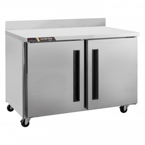 Centerline™ Compact Undercounter Refrigerator with Work Top, two-section, 36"W, 9.0 cu. ft. capacity, self-contained rear-mount refrigeration, (1) left hinged/ (1) right hinged solid doors (field reversible), electronic control with LED display, (2) epoxy coated shelves per section, 4" backsplash, stainless steel exterior, anodized aluminum interior, (4) casters, R450A refrigerant, 1/4 HP, 115v/60/1-ph, 3.3 amps, NEMA 5-15P, cETLus, ETL-Sanitation, ENERGY STAR®