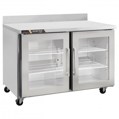 Centerline™ Compact Undercounter Refrigerator with Work Top, two-section, 48"W, 13.28 cu. ft. capacity, self-contained rear-mount refrigeration, (2) right hinged glass doors (field reversible), electronic control with LED display, (2) epoxy coated shelves per section, 4" backsplash, stainless steel exterior, anodized aluminum interior, (4) casters, R450A refrigerant, 1/4 HP, 115v/60/1-ph, 3.6 amps, NEMA 5-15P, cETLus, ETL-Sanitation, ENERGY STAR®