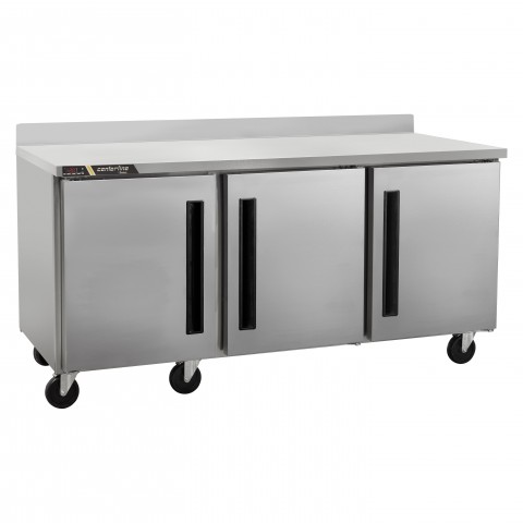 Centerline™ Compact Undercounter Freezer with Work Top, three-section, 72"W, 18.80 cu. ft. capacity, self-contained rear-mount refrigeration, (1) left hinged/ (2) right hinged solid doors (field reversible), electronic control with LED display, (2) epoxy coated shelves per section, 4" backsplash stainless steel exterior, anodized aluminum interior, (6) casters, R290 Hydrocarbon refrigerant, 1/2 HP, 115v/60/1-ph, 7 amps, NEMA 5-15P, cETLus, ETL-Sanitation, ENERGY STAR®