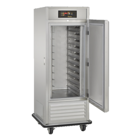 Spec-Line Refrigerator, Air Curtain, one-section, self-contained refrigeration, digital thermometer, electronic controls, Smart Defrostâ„¢ Technology, stainless steel exterior and interior, half-height doors hinged right, with bumpers, 1/2 HP, 6" casters, cULus, ETL-Sanitation