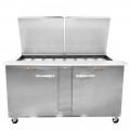 Dealer's Choice Compact Prep Table Refrigerator with low-profile flat lid, Reach-in, two-section, 60" wide, holds (12) 1/6 pans 4" deep (included), can accommodate up to 6" deep pans, full length white reversible cutting board, (2) stainless steel doors, both hinged left, stainless steel top, sides & back, galvanized bottom, anodized aluminum interior with (4) shelves, rear mounted, self-contained refrigeration, R290 Hydrocarbon refrigerant, (6) 4" casters, 1/5 HP, cETLus, ETL-Sanitation