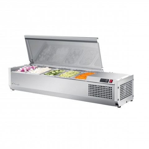 E-Line Countertop Salad Table, 48-3/8"L, side mounted self-contained refrigeration, accommodates (5) GN 1/4 size x 6" deep condiment pans (pans not included), digital temperature display on front panel, static cooling system, R290 Hydrocarbon refrigerant, stainless steel interior & exterior, 1/6 HP, 115v/60/1-ph, 1.3 amps, NEMA 5-15P, cETLus, ETL-Sanitation (contact sales for lead time)