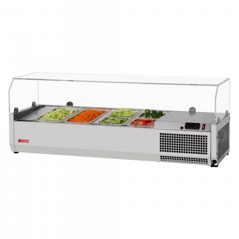 E-Line Countertop Salad Table, with clear hood, 47-1/4"L, side mounted self-contained refrigeration, accommodates (8) GN 1/6 size or (4) GN 1/3 size 6″ deep condiment pans (pans not included), digital temperature display on front panel, static cooling system, R290 Hydrocarbon refrigerant, stainless steel interior & exterior, 1/6 HP, 115v/60/1-ph, 2 amps, NEMA 5-15P, cETLus, ETL-Sanitation (contact sales for lead time)