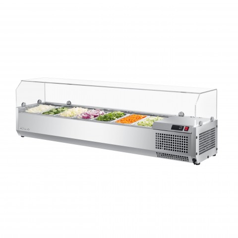 E-Line Countertop Salad Table, with clear hood, 60-1/4"L, side mounted self-contained refrigeration, accommodates (7) GN 1/4 size x 6" deep condiment pans (pans not included), digital temperature display on front panel, static cooling system, R290 Hydrocarbon refrigerant, stainless steel interior & exterior, 1/6 HP, 115v/60/1-ph, 1.3 amps, NEMA 5-15P, cETLus, ETL-Sanitation (contact sales for lead time)