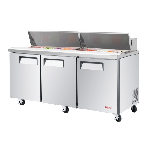 E-line Sandwich/Salad Unit, three section, 72-5/8"W x 30"D x 37-1/2"H, 19 cu. ft., self-contained refrigeration, (3) solid doors, (3) adjustable PE coated wire shelves, (18) 1/6 size x 4" deep pan capacity, (2) hoods, cold air compartment, 9-1/2" deep cutting board with side rail, stainless steel doors, aluminum exterior (galvanized steel back & bottom), casters, R290 Hydrocarbon refrigerant, 3/8 HP, 115v/60/1-ph, 5.5 amps, cord with NEMA 5-15P, cETLus, ETL-Sanitation (Contact sales for lead time)