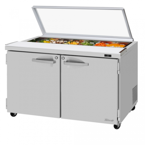 PRO Series Sandwich/Salad Prep Table with Glass Lid, two-section, rear mount self-contained compressor, 12.0 cu. ft., 48-1/4"W x 32-7/8"D x 31-3/4"H, 12-pans, (2) solid hinged swing doors with locks, aluminum door liner, (2) stainless steel shelves, 6-1/4" deep cutting board with side rail, digital temperature control & monitor system, cold bunker system, stainless steel interior & exterior (galvanized bottom), LED interior lighting & fan control, self-cleaning condenser, R290 Hydrocarbon refrigerant, 1/5 HP, 115v/60/1-ph, 6.5 amps, NEMA 5-15P cETLus, ETL-Sanitation, Made in USA (contact sales for lead time)
