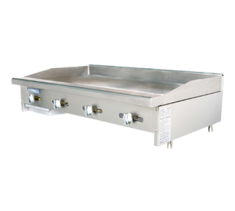 Radiance Griddle, countertop, gas, 48"W x 30"D, stainless steel front & side, built-in stainless steel splash guard, 3/4" thick highly polished steel griddle plate, (4) burner, aluminized U shaped burners & manual controls for every 12", individual heat resistant on-off knob, 3" wide front grease trough, removable grease pan, bullnose stainless steel front extension, 2" stainless steel standard legs, regulator included, total 88,000 BTU, CSA, CSA-Sanitation