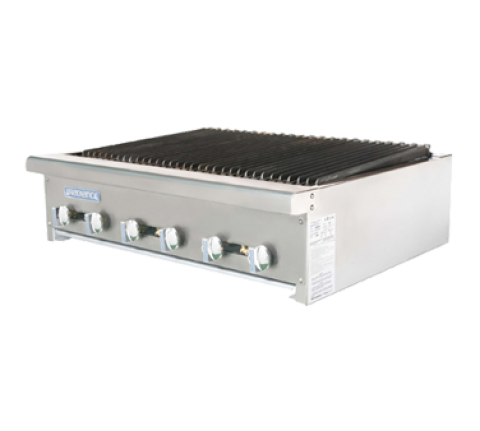 Radiance Charbroiler, countertop, gas, 36" wide, 16 ga. stainless steel front plate & wrap, heavy duty cast iron radiant & grates (6) burners with manual controls, removable grease pan, bullnose stainless steel front extension, heat resistant on-off knob, 2" stainless steel standard legs, regulator included, total 90,000 BTU, CSA, CSA-Sanitation