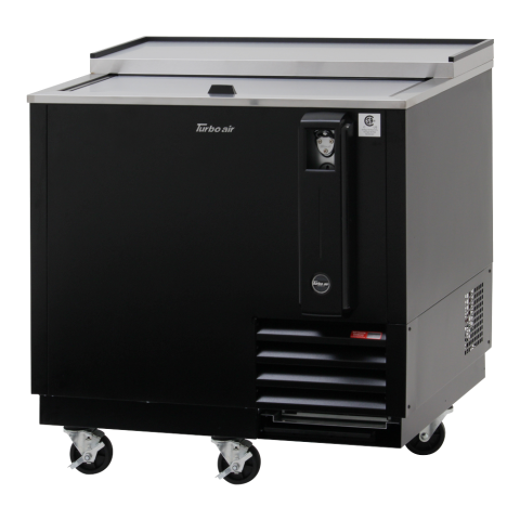 Super Deluxe Bottle Cooler, 36-3/4"W x 26-1/2"D x 33-1/4"H, 8.5 cu.ft., self-cleaning condenser equipped, self-contained, (2) PE coated adjustable dividers, built-on removable bottle cap opener & catcher, (1) sliding lid, stainless steel countertop & lid, black laminated exterior, stainless steel inside walls & floor, galvanized steel interior top, side mount compressor, front breathing, (5) casters standard, R600a Hydrocarbon refrigerant, 1/8 HP, 115v/60/1-ph, 1.6 amps, cord with NEMA 5-15P, cETLus, ETL-Sanitation