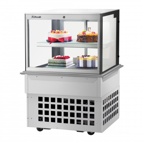 Drop-In Refrigerated Bakery Display Case, 38-1/8"W, 9 cu. ft. capacity, self-contained refrigeration with self-cleaning condenser, straight front tilt-out tempered glass, tempered glass side pannels, sliding rear doors, digital temperature controller, (1) adjustable tempered glass shelf with stainless steel front & back edges, LED interior lighting, stainless steel floor & airflow grille, 3" swivel casters (rear locking), R290 Hydrocarbon refrigerant, 1/3 HP, 115v/60/1-ph, 6.3 amps, cord with NEMA 5-15P, cETLus, ETL-Sanitation (Contact sales for lead time)