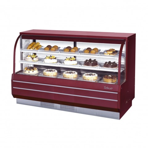 Refrigerated Bakery Display Case 72-1/2"W, 23.2 cu. ft., curved front tempered glass, sliding rear doors, self-cleaning condenser equipped, self-contained refrigeration, (2) adjustable cantilevered wire shelves, safety shielded LED interior lighting, solar powered digital thermometer, digital electronic thermostat with defrost control, stainless steel floor & airflow grille, anti-corrosion coated evaporator, wine exterior color, R290 Hydrocarbon refrigerant, 3/4 HP, 115v/60/1-ph, 8.6 amps, NEMA 5-15P, CSA-Sanitation, cCSAus (contact factory for price)