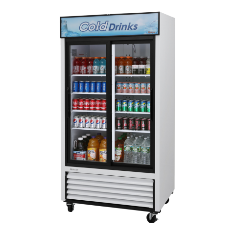 Refrigerated Merchandiser, two-section, 29.27 cu. ft., self-contained, (2) double pane Low-E self-closing sliding glass doors with stay open door feature, LED interior & canopy lighting, energy conserving fan control, hot gas condensate system, (8) adjustable PE coated wire shelves, white cabinet with black trim, bottom mount compressor, R290 Hydrocarbon refrigerant, 1/3 HP, 115v/60/1-ph, 3.2 amps, cord, NEMA 5-15P, cETLus, ETL-Sanitation
