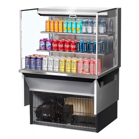 Drop-In Horizontal Open Display Case, low profile, 11.1 cu. ft. capacity, 35-7/8"W x 33"D x 52-1/2"H, self-contained refrigeration with self-cleaning condenser, (2) glass shelves + deck, tempered glass front shield & side walls, solar digital thermometer, digital electronic thermostat with defrost control, LED interior lighting, stainless steel interior & exterior, back wall & deck pan, front air intake & rear air discharge, includes night cover, R290 Hydrocarbon refrigerant, (2) 3/4 HP, 115v/60/1-ph, 11.3 amp, cord with NEMA 5-20P, cETLus, ETL-Sanitation (Contact sales for lead time)