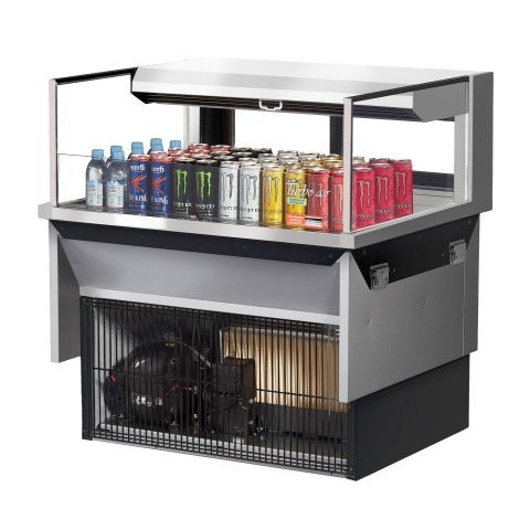 Drop-In Horizontal Open Display Case, low profile, 4.6 cu. ft. capacity, 35-7/8"W x 33-3/4"D x 37-3/4"H, self-contained refrigeration with self-cleaning condenser, deck only, tempered glass front shield & side walls, rear sliding glass doors, solar digital thermometer, digital electronic thermostat with defrost control, LED interior lighting, stainless steel interior & exterior, front air intake & rear air discharge, includes night cover, R290 Hydrocarbon refrigerant, (2) 3/4 HP, 115v/60/1-ph, 11.3 amp, cord with NEMA 5-20P, cETLus, ETL-Sanitation (Contact sales for lead time)
